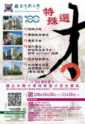 一、本校特殊選才招生報名日期訂於108年10月28日起至11月18日止,採網路報名,郵寄審查資料。報名網址為http://recruit.nchu.edu.tw/。自即日起,招生簡章開放下載。