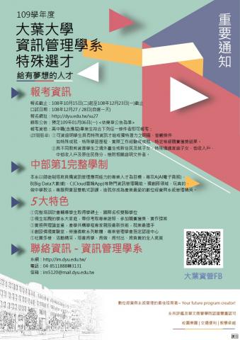 主旨:檢送本校109學年度特殊選才招生考試相關訊息,敬請惠予推薦學生報考,請查照。