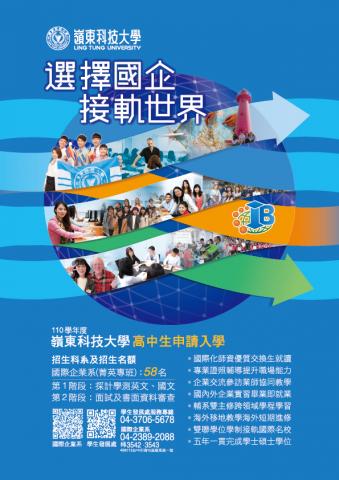 一、嶺東科技大學110學年度科技校院日間部四年制申請入學聯合招生計國際企業系、數位媒體設計系等二系,提供高中生以學測成績入學,兩系電子文宣如附件一、二。