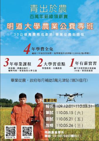 一、行政院農業委員會委託明道大學執行農業公費生(農業公費專班)培育計畫,以推動新農民培育。